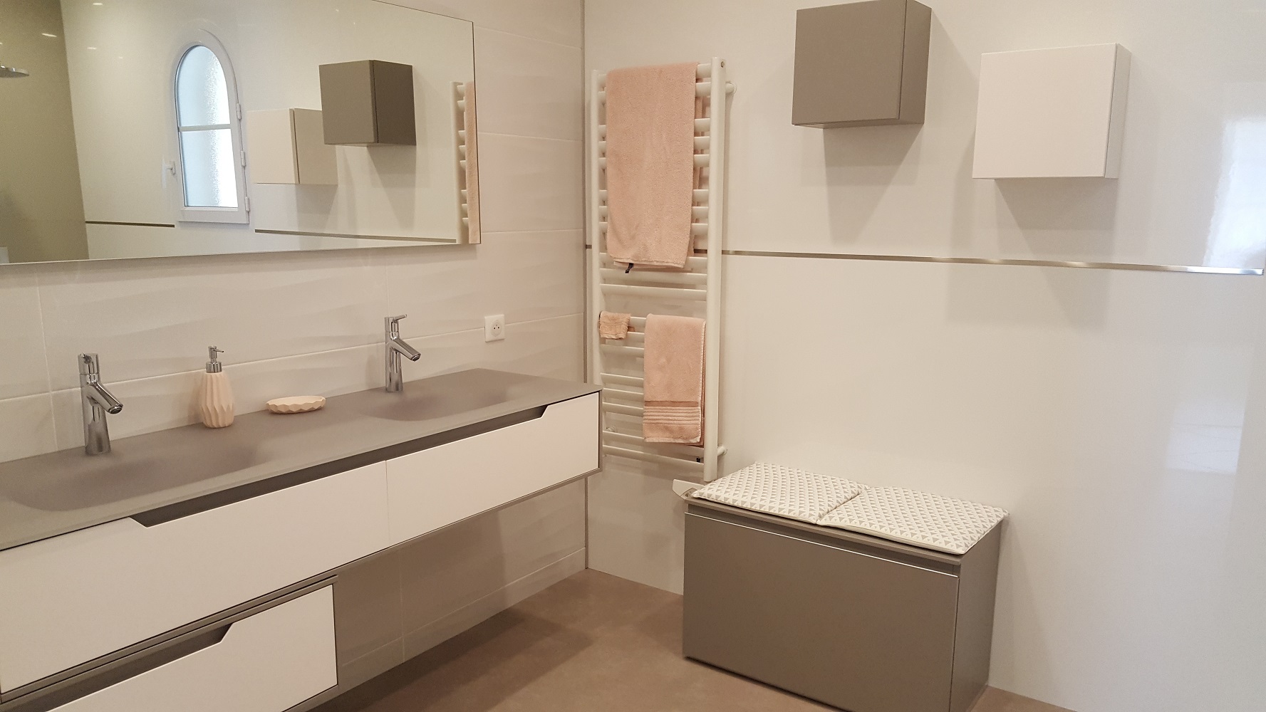 Un receveur avec banc de dépose pour les produits du quotidien, ainsi que le panneau du fond en coloris gris soie ; le reste de la salle d’eau en panneaux blancs, et un choix de meubles sanitaires assortis pour une harmonie parfaite. U n revêtement de sol vinyle aspect béton ciré, choisi par le client, vient finaliser la rénovation complète de cet espace familial.